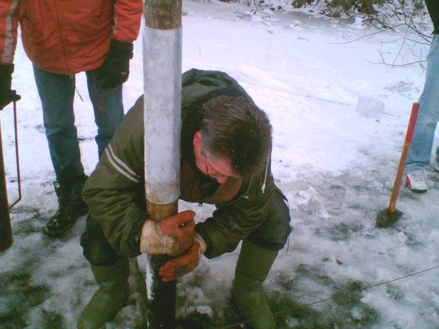 Hier das Bild von der anderen Seite. So werden die Stämme in den Untergrund getrieben. Mit guter alter Handarbeit und Muskelkraft.